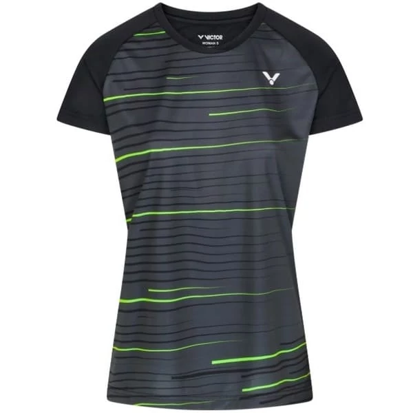 A Victor T-34101 C női tollaslabda póló elegáns fekete színben mutatkozik be, modern és sportos megjelenést kínálva. Anyaga 100% újrahasznosított poliészter, amely környezettudatos választás, könnyű és gyorsan száradó viselet.